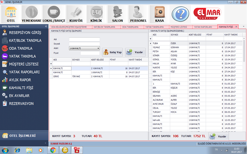 Resepsion Kat Tanımlama Oda Tanımlama Yatak Ekleme Müşteri Listesi Müşteri Raporları Oda Raporları Yatak Raporları EGM Rapor Gönderim |